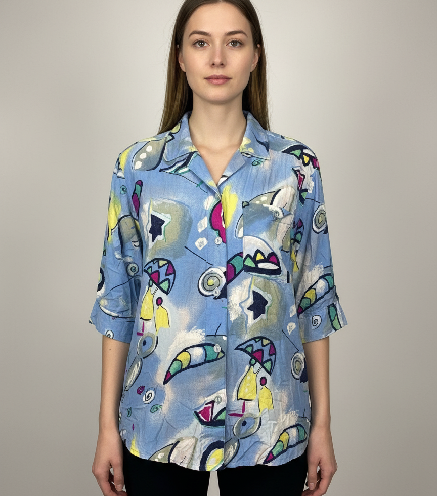 Unleash your artistic side with our vibrant Abstract Art Hip-Cover Shirt. This unique 3/4 sleeve blouse features a captivating print of bold, brushstroke-like abstract shapes in a playful palette of blues, yellows, pinks, and greens against a soft blue background. It's a statement piece that blends artistic expression with effortless style.