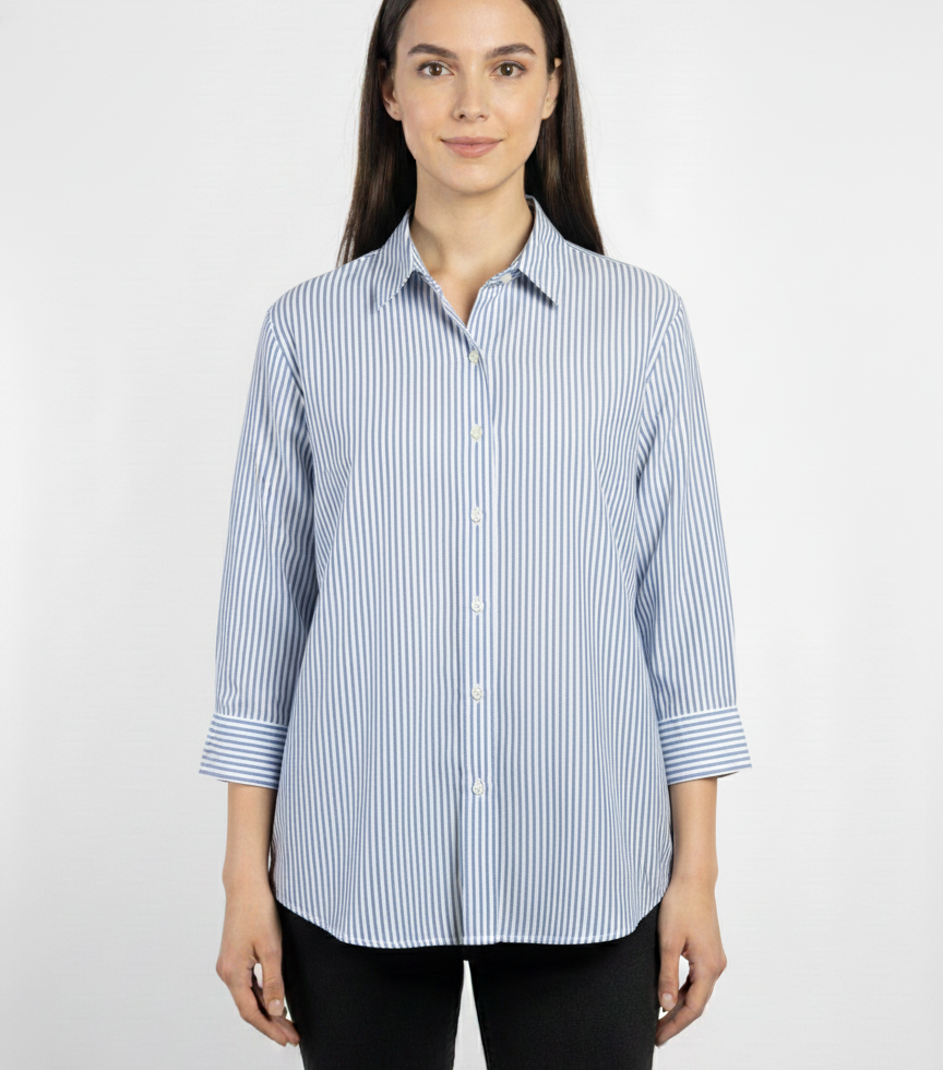 Crafted for comfort and timeless style, this shirt features a crisp, breathable fabric with vertical blue and white stripes that offer a flattering, elongating effect. The design includes a traditional pointed collar, a full button placket, and versatile 3/4 length sleeves with adjustable cuffs.