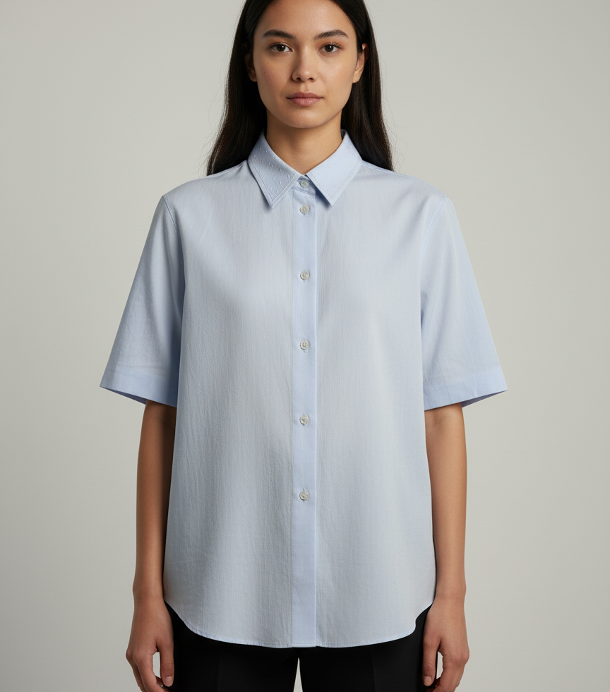 A fresh update on a timeless essential, this Classic Light Blue Short Sleeve Shirt offers comfort and polish. Made from a crisp, breathable fabric, this blouse features a traditional pointed collar and a clean, full button-down placket. The relaxed, slightly boxy fit and wide short sleeves create a modern, easy silhouette. The hem is designed with a slight curve, ensuring it provides a comfortable hip cover length suitable for both professional and casual wear.