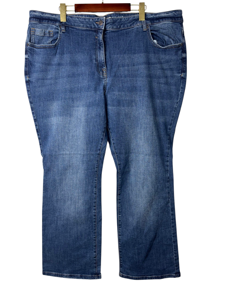 TThese essential Women's Plus Size Straight-Leg Jeans are a comfortable and reliable staple for every season. They feature a classic medium indigo wash with subtle whiskering and fading, offering a natural, versatile appearance. The comfortable straight-leg silhouette ensures a balanced fit through the hip and leg, making them a great base for any casual or semi-dressy ensemble.Key Features:Wash & Color: Classic medium indigo wash with natural fading.Style: Timeless straight-leg cut (or a very subtle bootcut).Rise: Comfortable high-rise waist ensures a smooth, secure fit and excellent coverage.Comfort: Likely stretch denim for all-day comfort and shape retention.Detail: Classic five-pocket styling (small, light distressing may be visible near the right pocket).Sizing Details (Approximate):Waist Size: 46 inchesHip Size: Approximately 54-56 inches (based on standard plus-size garment grading for a 46-inch waist)