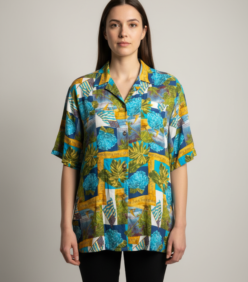 Capture a fresh, feminine look with this Lightweight Blue Rose Print Shirt. This airy blouse features a delicate pattern of vibrant blue roses scattered across a cream background. It is designed with a relaxed camp collar and short sleeves, creating a comfortable and breathable fit perfect for sunny days. The straight hem falls to a modest length, ensuring it provides adequate hip cover length for effortless styling, whether paired with white trousers or denim.