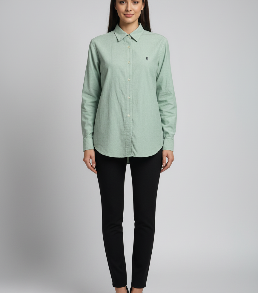 Refresh your smart-casual collection with our classic Mint Oxford Hip-Cover Shirt. This long-sleeve blouse features a soft, textured fabric in a delicate mint green color, offering a crisp yet comfortable look perfect for the office or relaxed weekend wear.