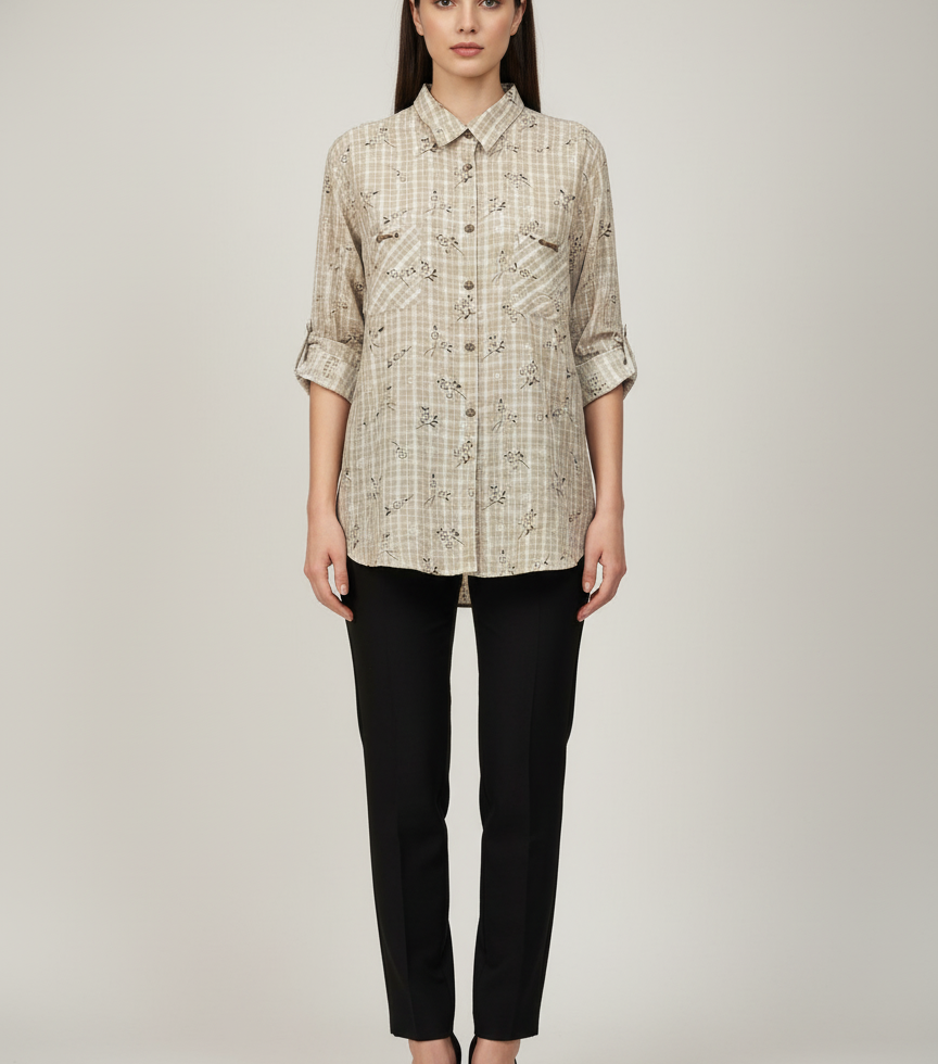 Combine classic and whimsical elements with our Plaid & Floral Hip-Cover Shirt. This versatile blouse features a subtle light-colored plaid pattern overlaid with a delicate, scattered floral or leaf print in darker tones, offering a unique blend of casual charm and refined detail.