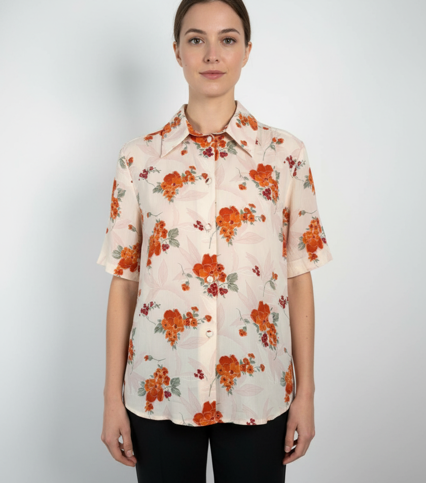 Vintage-Style Short-Sleeve Shirt with Orange Flower Print