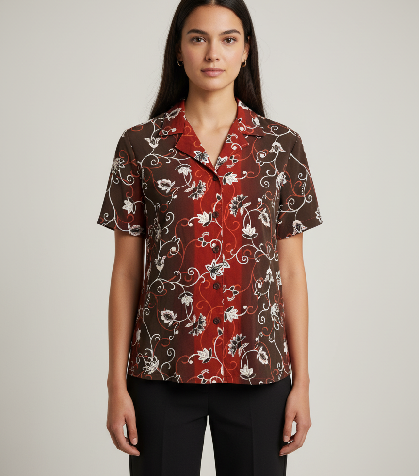 Infuse your look with rich, autumnal tones in this Rich Brown & Red Floral Camp Shirt. This unique blouse features a striking combination of dark brown and deep red panels overlaid with an elegant white vine and floral pattern. Designed with a stylish V-neck camp collar and short sleeves, it offers a sophisticated, breathable fit. The versatile cut ensures the hem falls to a practical length, providing comfortable hip cover length for a polished and flattering silhouette.