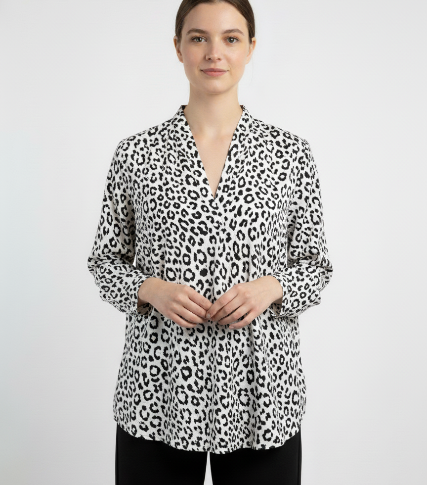 Make a bold, stylish statement with this sophisticated long-sleeve blouse, available here in Size 52. The classic black and white leopard print offers timeless appeal with modern flair.