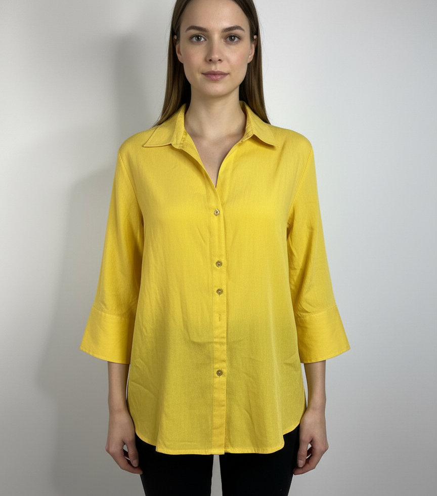 Details: Classic collared neckline, full button-down front with tonal buttons, and a soft, lightweight fabric that drapes well.